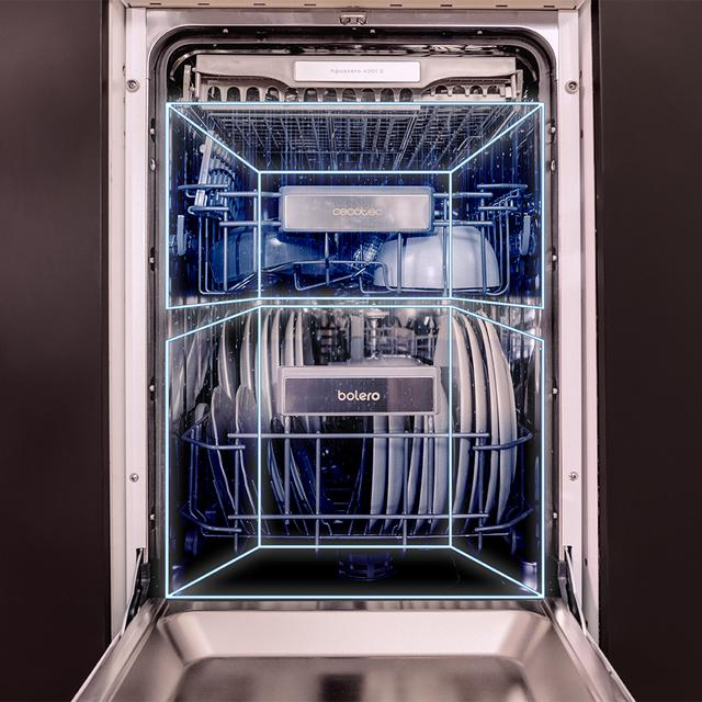 - Dual Zone Wash: adapta una presión de agua distinta en cada bandeja. Despreocúpate de separar la vajilla en distintos ciclos de lavado y lava a la vez ollas resistentes, copas delicadas, recipientes muy sucios, menos sucios…