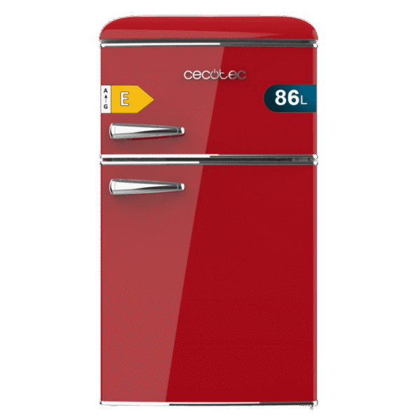 Bolero CoolMarket 2D Origin 86 Red E Mini frigorífico retro de dos puertas rojo de 89,3cm de alto y 48,7 de ancho con capacidad de 86L, clase energética E, LED interior y tirador cromado.
