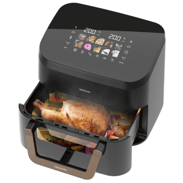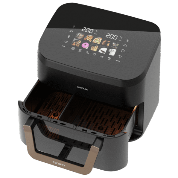 Cecofry&Grill Smokin’ 11000 Freidora de aire con triple grill en la parte superior e inferior para dorado perfecto y sabor de parrilla en carnes, ahumador, capacidad de 11 litros, potencia de 2900 W para platos saludables y pared divisoria móvil para optar entre dos cestillos con temperatura dual o convertirse en una sola cubeta.